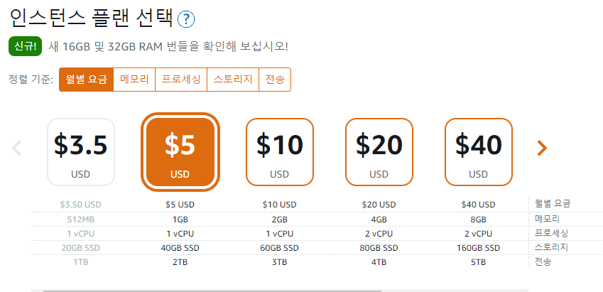 - "Amazon Lightsail" 을 이용하여 설정 (요금은 리눅스 기준 아래와 같습니다.)