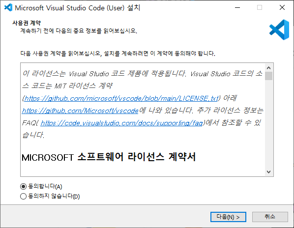 4. "동의합니다(A)" 선택 후, "다음(N)>" 버튼 선택