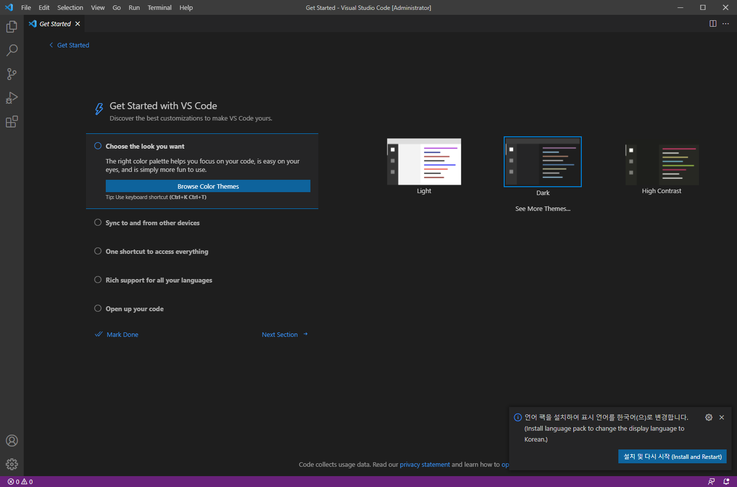 11. 정상적으로 설치가 되었으면, 아래와 같이 Visual Studio Code 가 실행 됨.