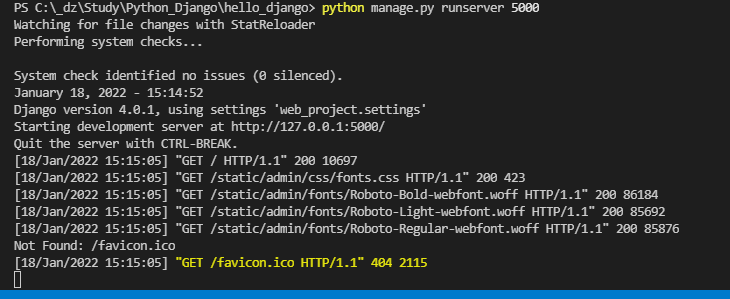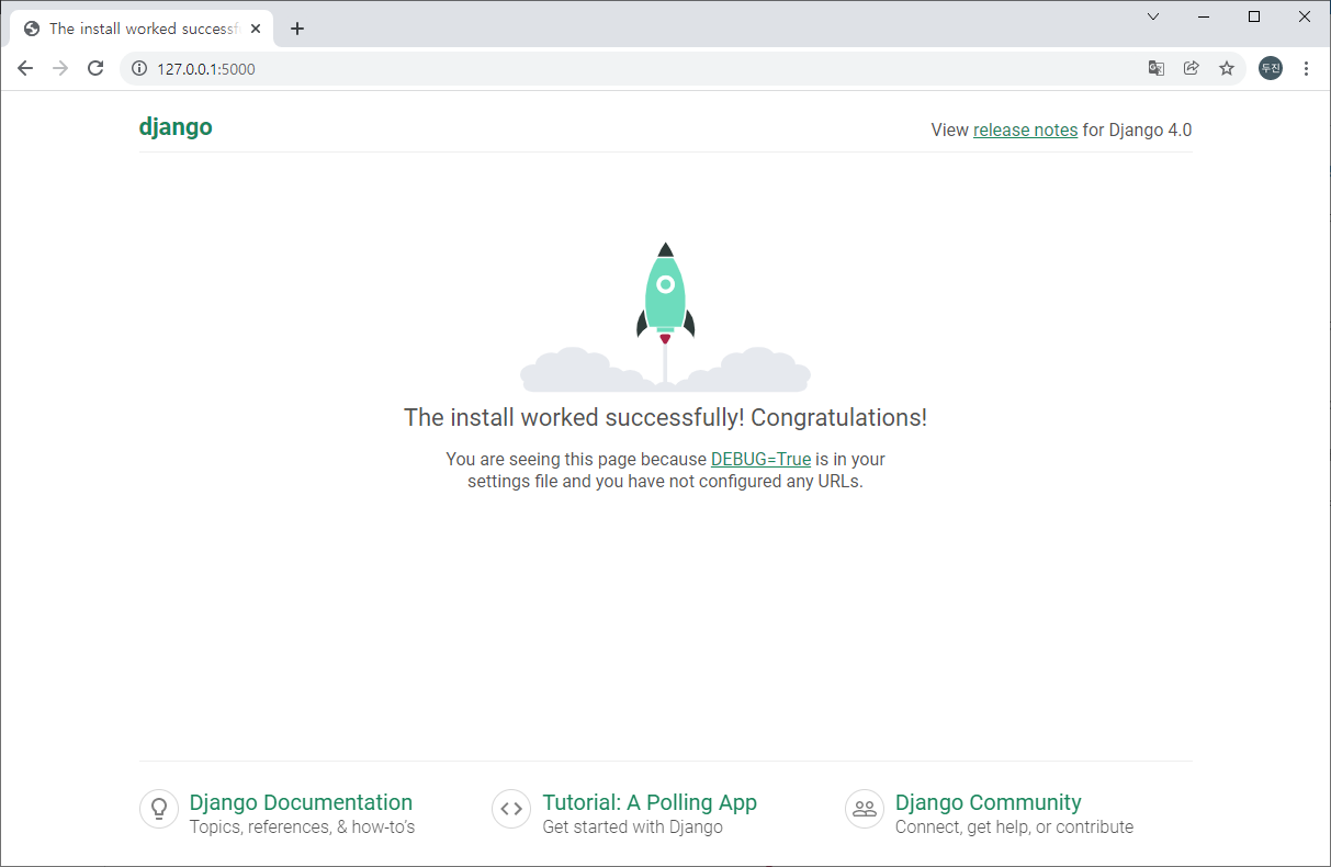 기본 8000이 아닌 다른 포트를 사용하려면 python manage.py runserver 5000 과 같이 명령줄에