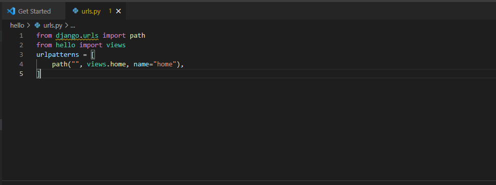 아래 코드에는 방금 hello/views.py에 추가한 views.home 함수에 앱의 루트 URL("")을 매핑하는 하나의 경로가 포함되어 있습니다.