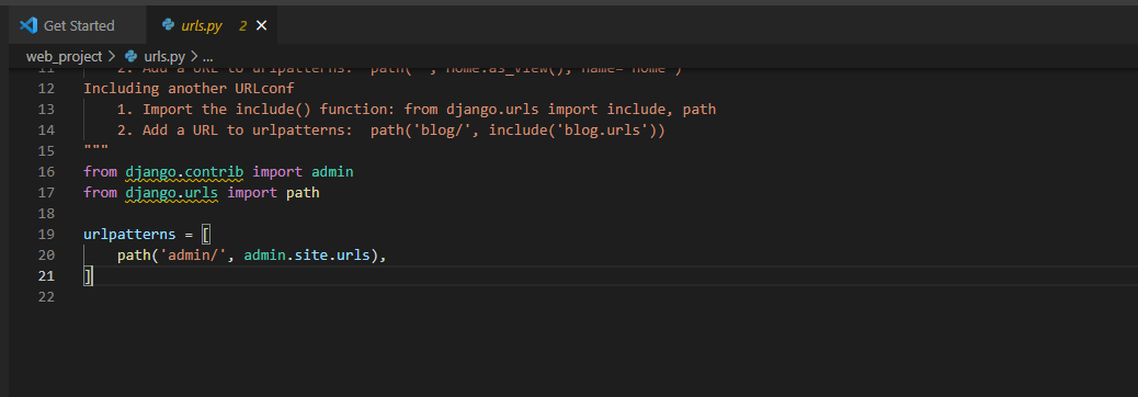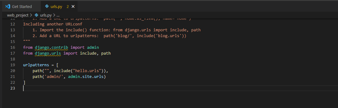 4. web_project/urls.py 를 열고 다음 코드와 일치하도록 수정합니다(원하는 경우 유익한 주석을 유지할 수 있음)