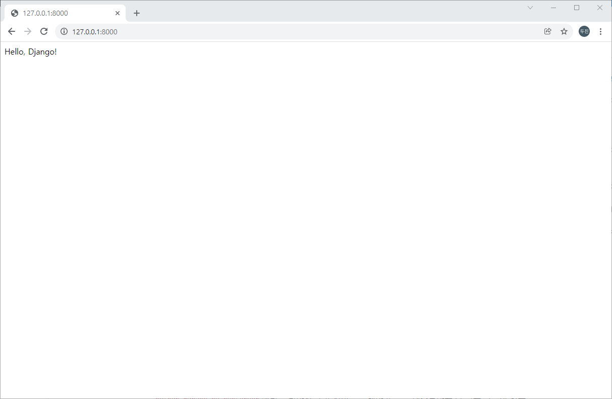 7. 브라우저를 http://127.0.0.1:8000/ 으로 열어 "Hello, Django"를 렌더링하는 페이지를 봅니다.