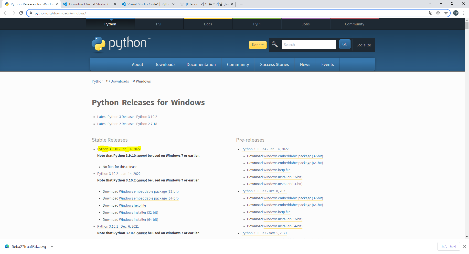 - Python 3.9.10 - Jan. 14, 2022 를 선택
