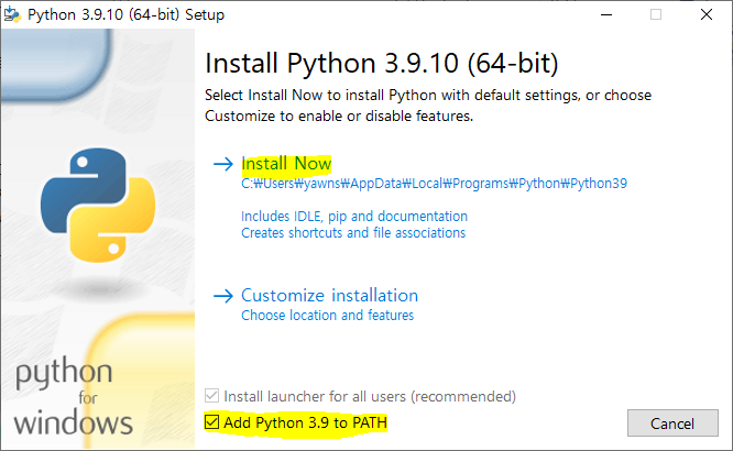 5. 하단의 "Add Python 3.9 to PATH" 를 꼭 체크(선택)한 후, "Install Now" 선택