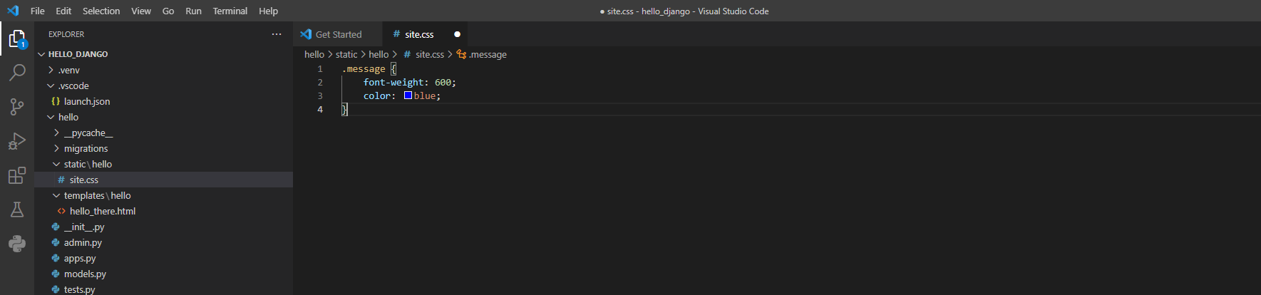 3. static/hello 폴더에 다음 내용으로 site.css 라는 파일을 생성합니다. 이 코드를 입력한 후 VS Code가 색상 미리보기를 포함하여 CSS 파일에 대해 제공하는 구문 강조 표시도 관찰하십시오.