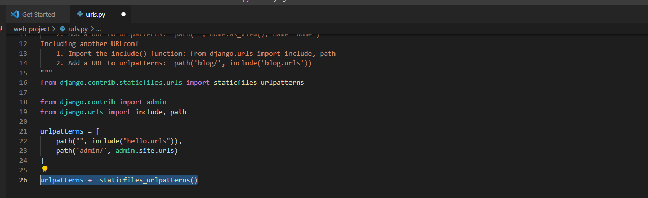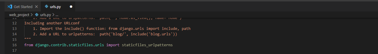 2. web_project/urls.py 에서 프로젝트가 인식하는 목록에 대한 표준 정적 파일 URL을 포함하는 다음 줄을 끝에 추가합니다.