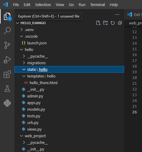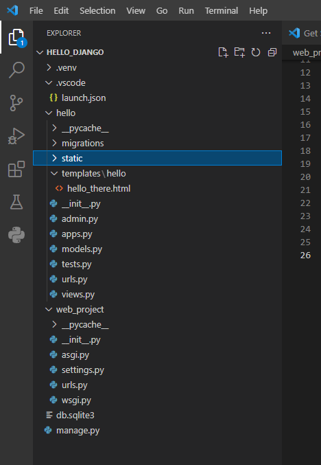 2. static 폴더 내에서 앱 이름과 일치하는 hello 라는 하위 폴더를 만듭니다.