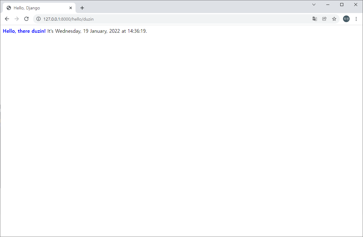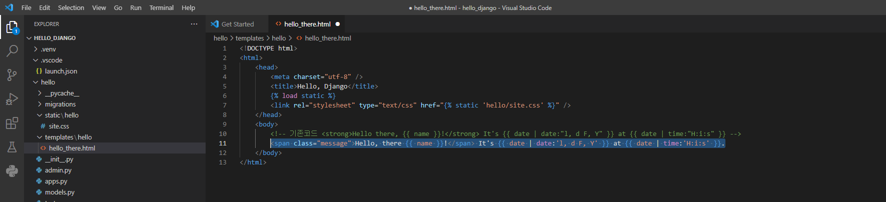 5. 또한 templates/hello/hello_there.html에서 콘텐츠 <body> 요소를 <strong> 태그 대신 message 스타일을 사용하는 다음 마크업으로 교체합니다.