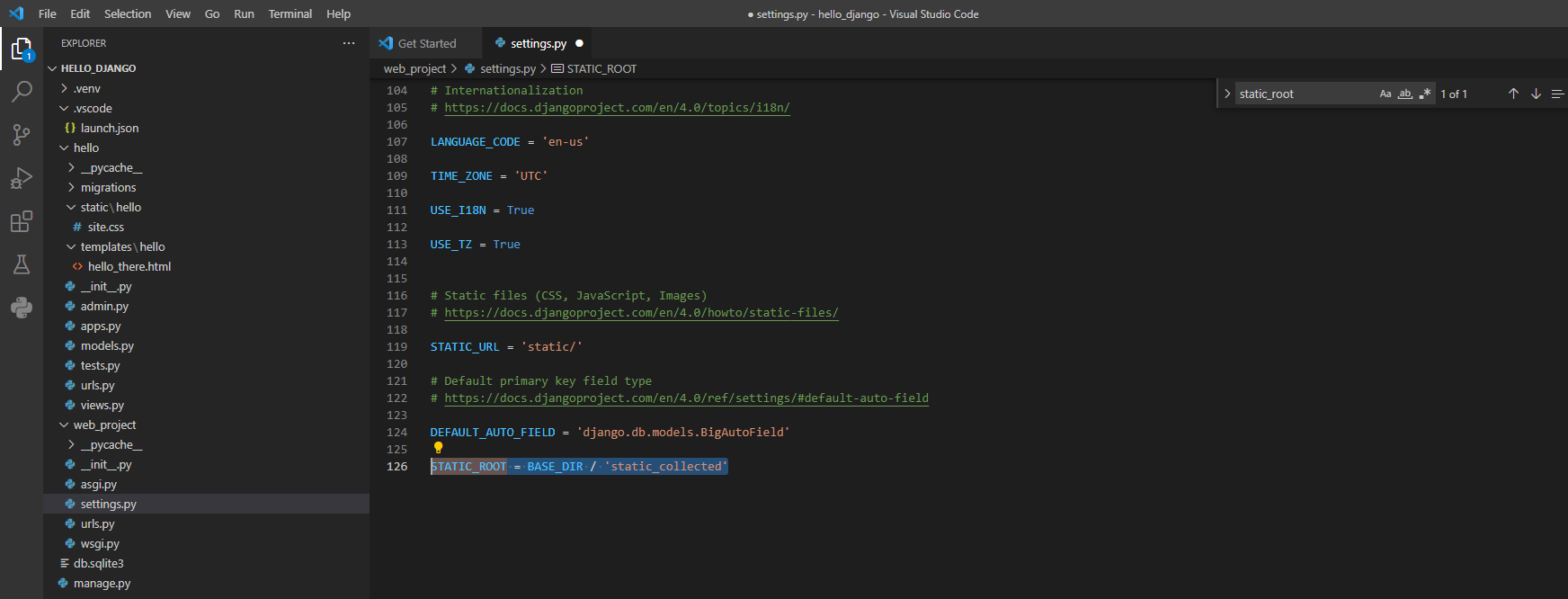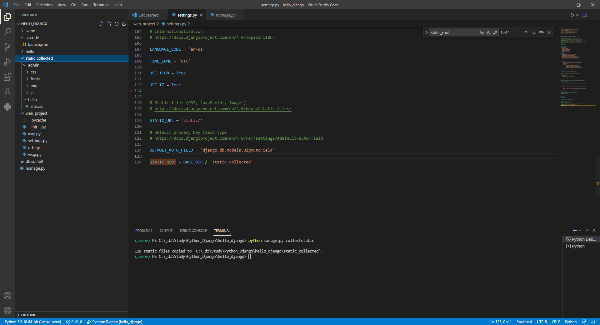 2. 터미널에서 python manage.py collectstatic 명령을 실행하고 hello/site.css 가 manage.py 와 함께 최상위 static_collected 폴더에 복사되는지 확인합니다.