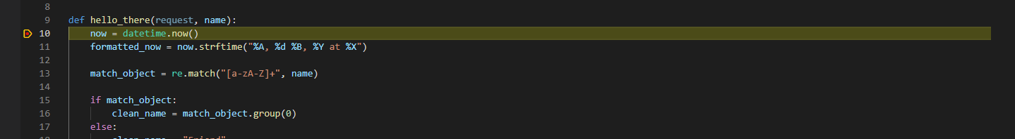 3. 다음 중 하나를 수행 하여 hello_there 함수( ) 의 첫 번째 코드 줄 ( now = datetime.now() ) 에 중단점을 설정합니다 .