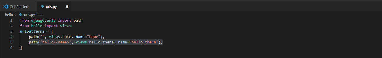 path 에 대한 첫 번째 인수는 name이라는 변수 문자열을 허용하는 "hello/" 경로를 정의합니다. 문자열은 path에 대한 두 번째 인수에 지정된 views.hello_there 함수에 전달됩니다.
